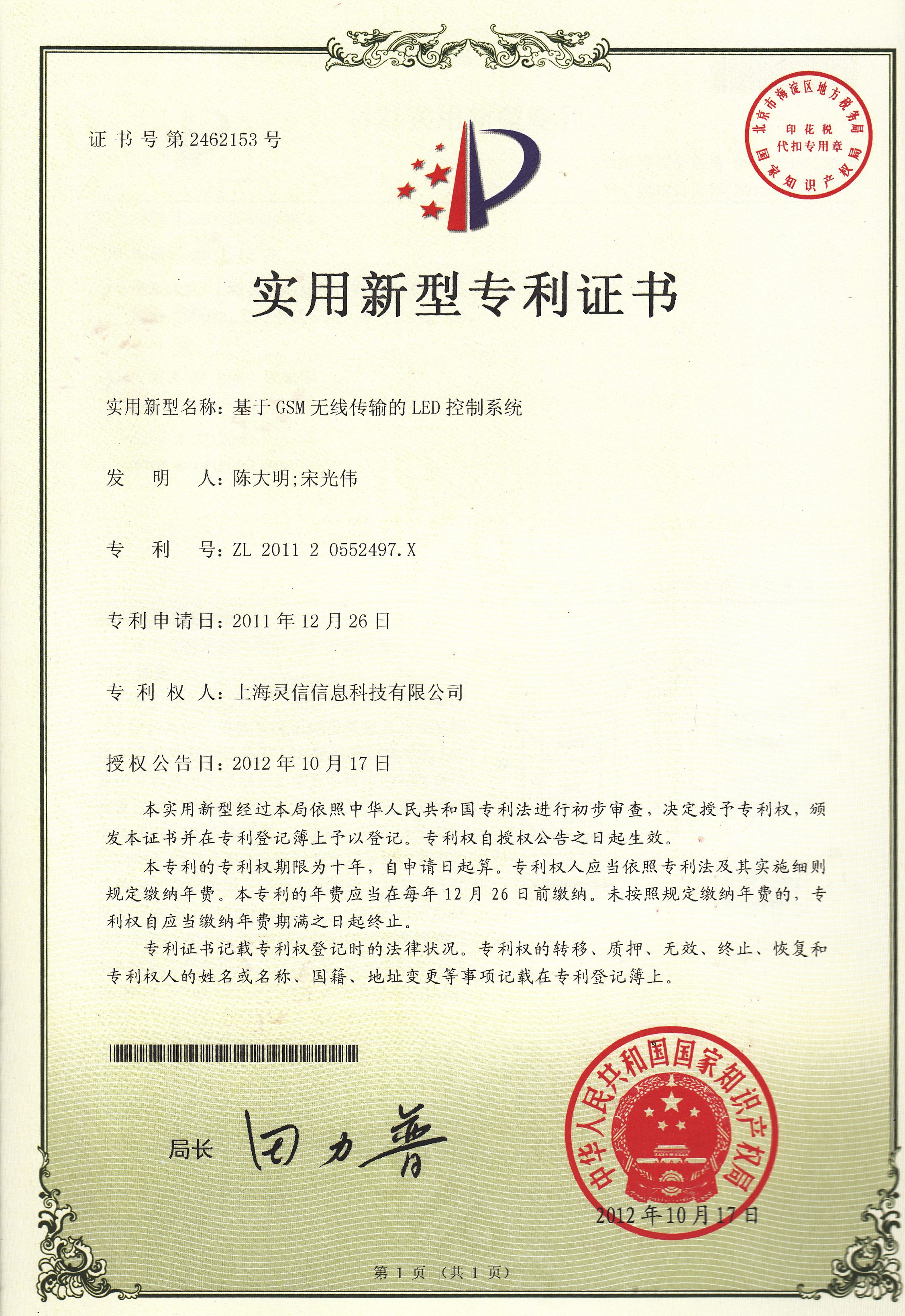 • 基于GSM無線傳輸的LED控制系統專利證書