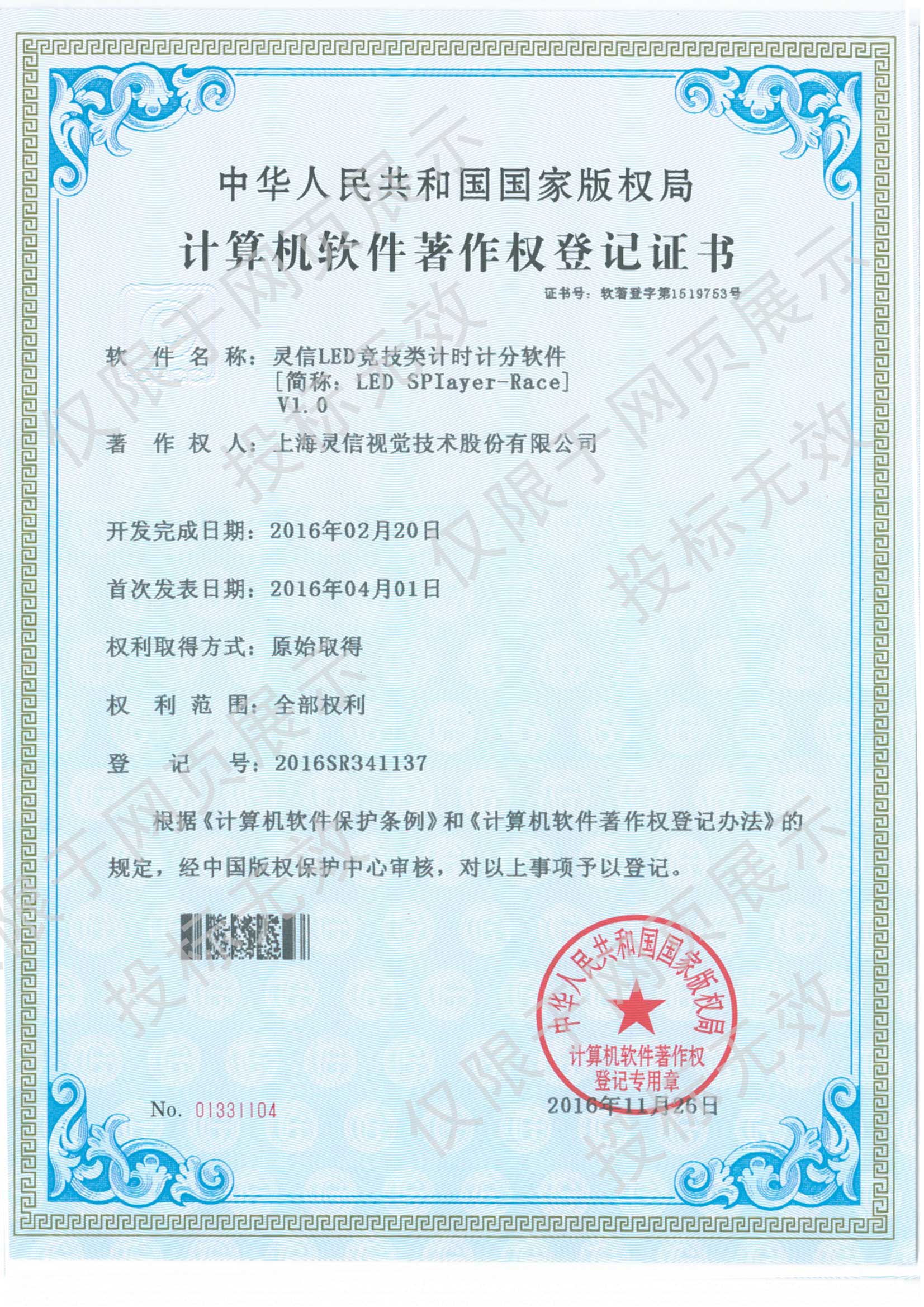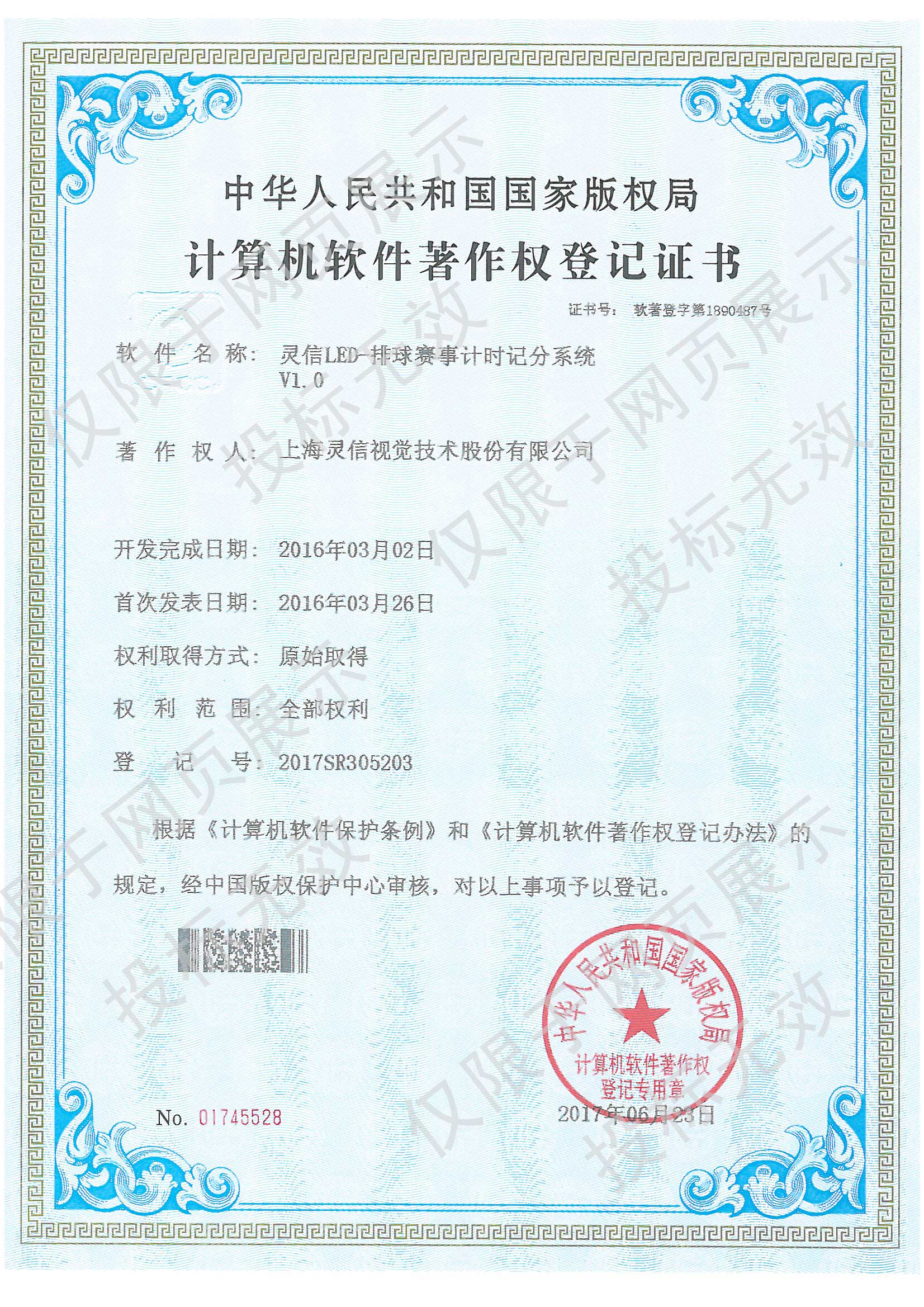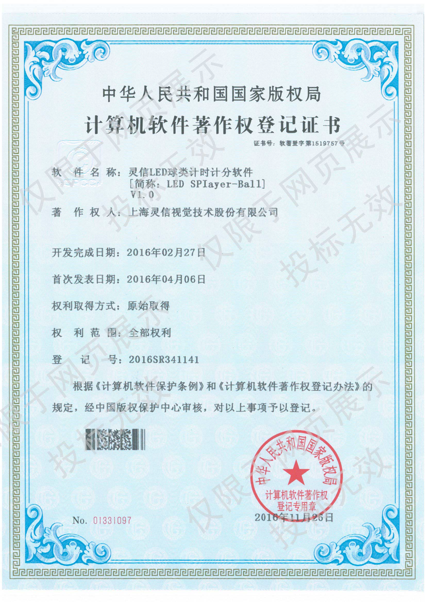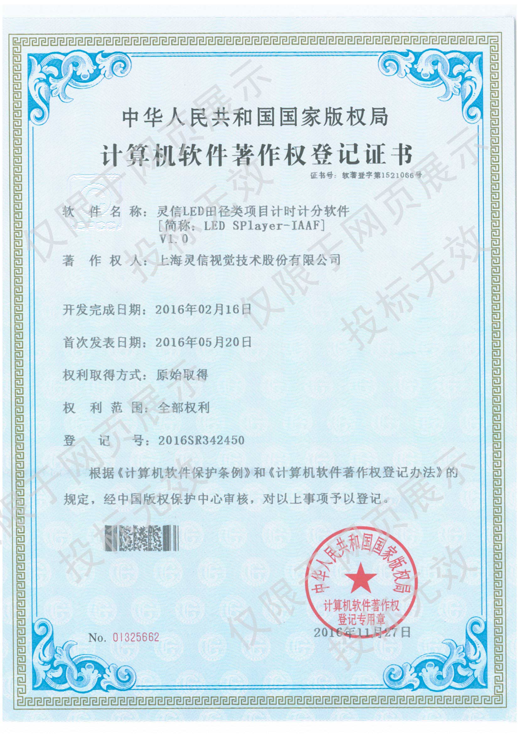 • 計算機軟件著作權登記證書