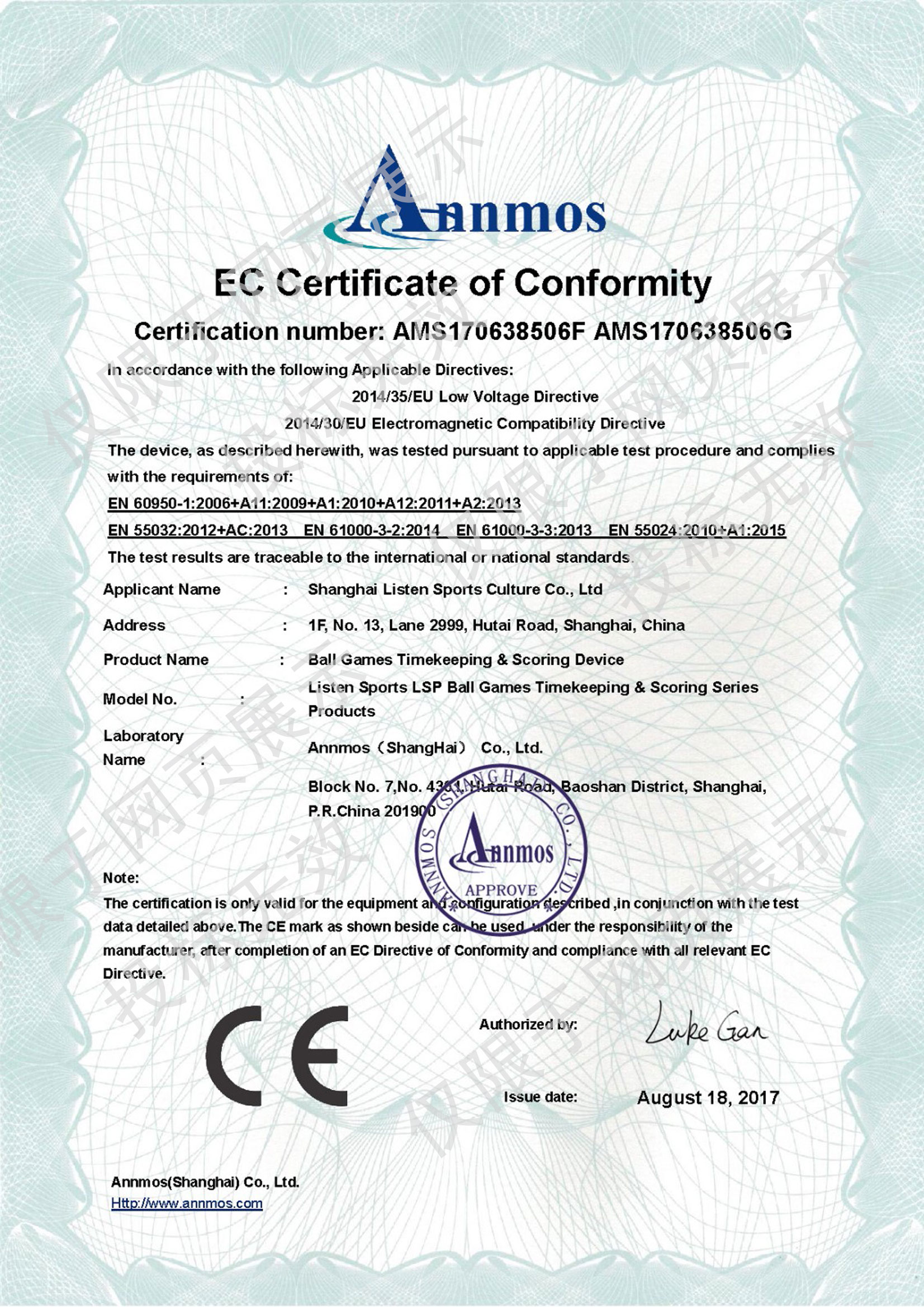 • 靈信體育CE-LVD&EMC 證書